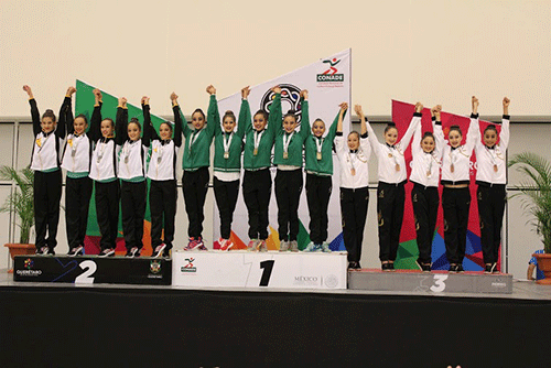 El pódium del Querétaro Centro de Congresos se pintó de verde con la actuación de las pequeñas gimnastas de 12-13 y 14-15 años en el segundo día de competencias de gimnasia rítmica con los aparatos clavas y pelota. Estos resultados se sumaron a los que obtuvieron ayer las atletas en las pruebas en cuerda y aro. La ganadora del All Around 14-15 años fue la Tamaulipeña Ledia Juárez con 52.70, dejando en alto el orgullo de Tamaulipas, mientras que la yucateca Fabiola Jiménez juntó una puntuación de 50.850 y la jarocha Britany Saenz se posicionó en el pódium por el tercer lugar con 49.983 puntos. En la final de pelota fue Yucatán que con 13.950 puntos se llevó el primer lugar,  Aguascalientes el segundo lugar con 13.550  y Jalisco el tercer lugar con 12.867 puntos.