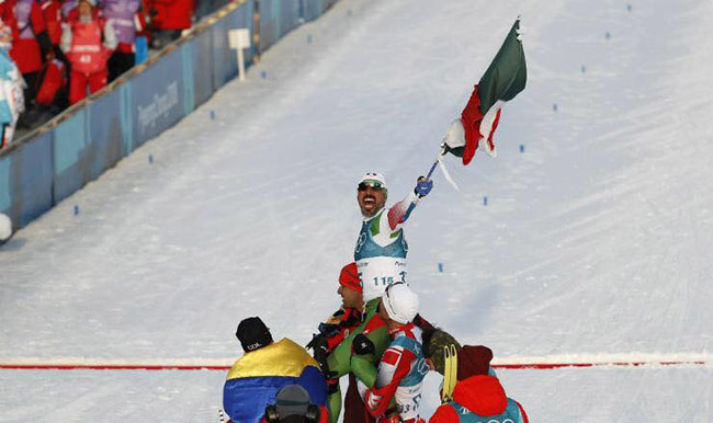A escasos metros de culminar el recorrido, Germán Madrazo recibió de manos de su representante Alfredo Gorráez el lábaro patrio que el atleta olímpico ondeo con orgullo al cruzar la meta; a pesar de que Madrazo llegó en la última posición de esta prueba, los competidores Pita Taufatofua, Sebastian Uprimn, Samir Azzimani, Kequyen Lam recibieron al esquiador mexicano levantándolo en hombros.