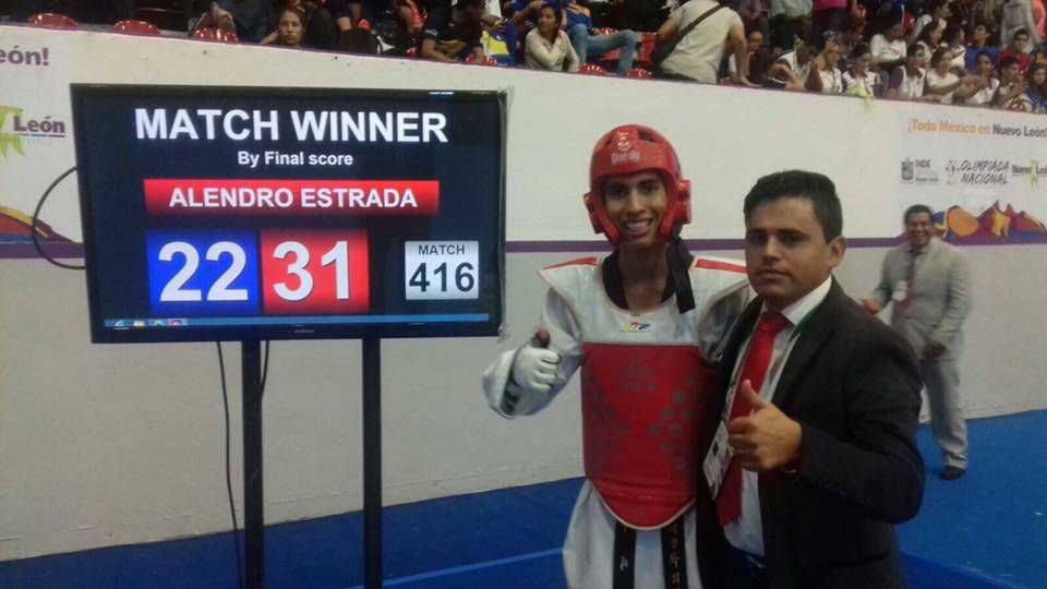 El queretano Alejandro Estrada Vielma de la categoría junior -59 kg obtuvo medalla de oro para Querétaro en el quinto día de competencias en la disciplina de Tae Kwon Do celebrado en el Gimnasio Nuevo León Gonzalitos de la capital regiomontana.