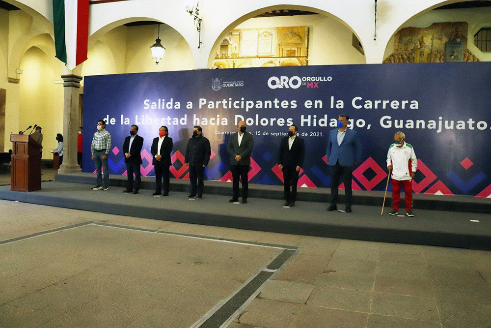 En el patio central de Palacio de Gobierno, con absoluto respeto a las medidas sanitarias ante la pandemia por la COVID-19, el secretario de Gobierno, Juan Martín Granados Torres, entregó la antorcha con el fuego simbólico al atleta Juan José Zacarías Uribe, fundador e integrante de la Carrera de la Conspiración de 1810 desde hace 69 años.