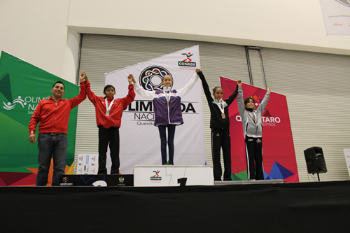 Con las gradas abarrotadas de espectadores, esta mañana dieron inicio las competencias de Kiorugui de las categorías 12-13 y 14-15 años, de la rama femenil y varonil. El Querétaro Centro de Congresos fue el escenario de esta disciplina, donde los atletas combatieron para coronarse en la Olimpiada Nacional 2016. En la categoría 2003- 2004 femenil, dentro de la división FIN (-29 kg), Eyleen Góngora de Nuevo León obtuvo la medalla de oro luego de vencer a su contrincante de Veracruz, María Rodríguez, quien se quedó con la plata. El bronce fue compartido entre la queretana, María Contreras, y la michoacana, Ximena Loeza. En la división Bantam (33.1-37 kg), la capitalina, Vanesa Gómez, se llevó el primer lugar tras derrotar en la final a Jarumi Cardona de Puebla. Por el tercer sitio fueron premiadas Fernanda Salgado de Tabasco, y Dulce Morales de Baja California. Indira Orea de Chiapas se colgó la de oro en la división Light (41.1 – 44 kg), dejando con la presea plateada a la chihuahuense, Joselyn Saenz. La mexiquense, Valeria Delgadillo, y la michoacana, Vanesa Ramírez, obtuvieron una presea de bronce. En la división Light middle (47.1-51 kg), la oaxaqueña, América Comonfort conquistó el campeonato, luego de obtener la victoria sobre Desiree Márquez de Chihuahua. La chiapaneca, Bertha Abarca, y la representante de la UNAM, quedaron en el tercer puesto tras perder en semifinales.