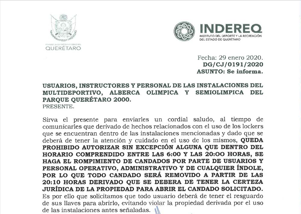 » Aviso importante a usuario de Albercas SemiOlímpica y Olímpica del Querétaro 2000
