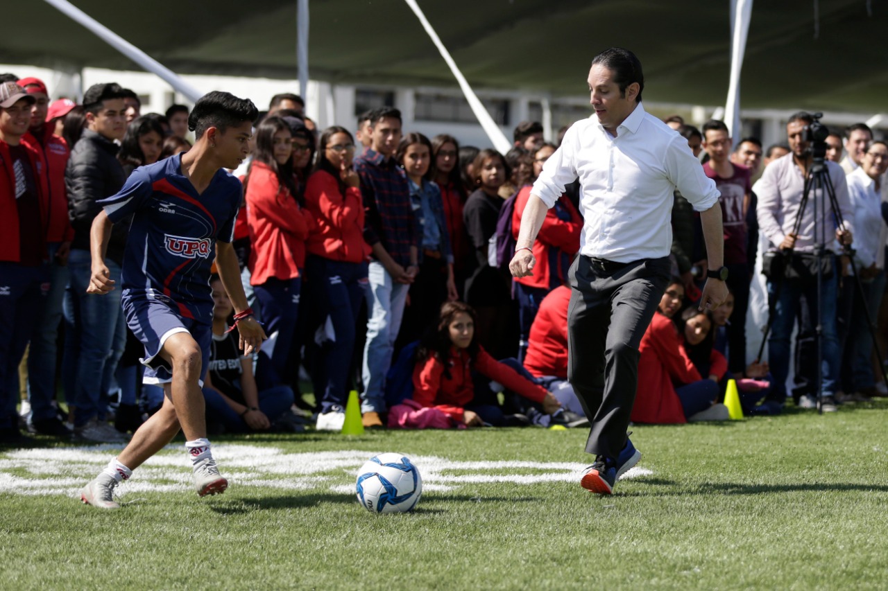 Con el objetivo de impulsar el deporte y el sano esparcimiento entre las y los jóvenes universitarios, el gobernador del estado, Francisco Domínguez Servién, entregó una cancha de futbol soccer, uniformes y material deportivo a la Universidad Politécnica de Querétaro (UPQ).